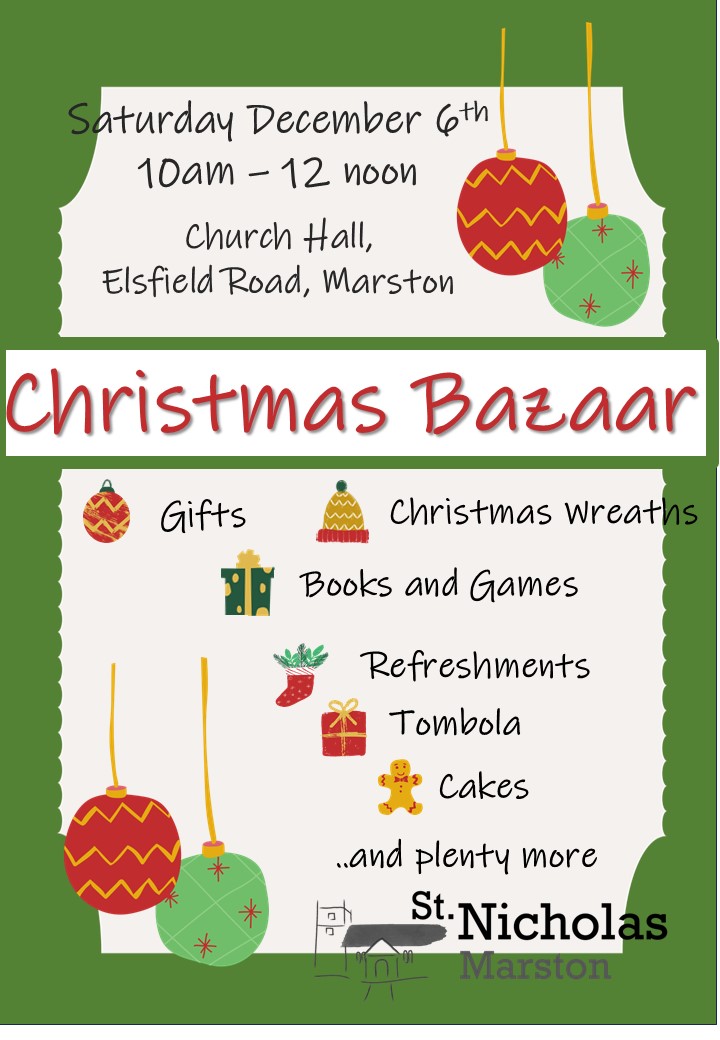 There will be a Christmas Bazaar organised by St Nicholas Church on Saturday 6th December 2025 from 10:00 to 12:00 at the church hall – entrance is free and all are welcome.